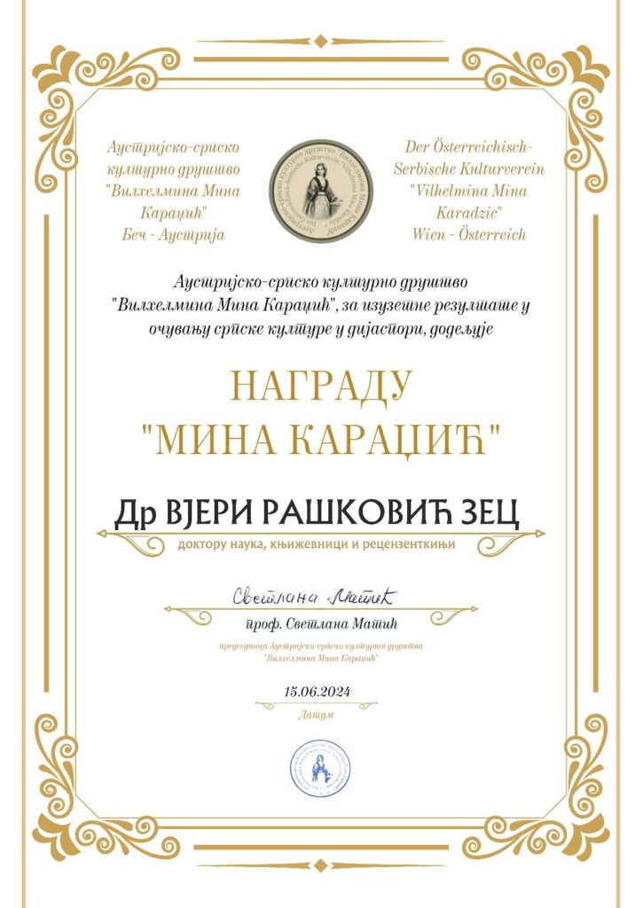 Академик професор Светлана Матић, председница АСКД „Вилхелмина Мина Караџић“ уручила је др Вјери Рашковић Зец, потпредседници Друштва, награду „Мина Караџић“ за 2024. годину. У образложењу се наводи да је Вјера Рашковић Зец остварила изузетне резултате у очувању српске културе у дијаспори.