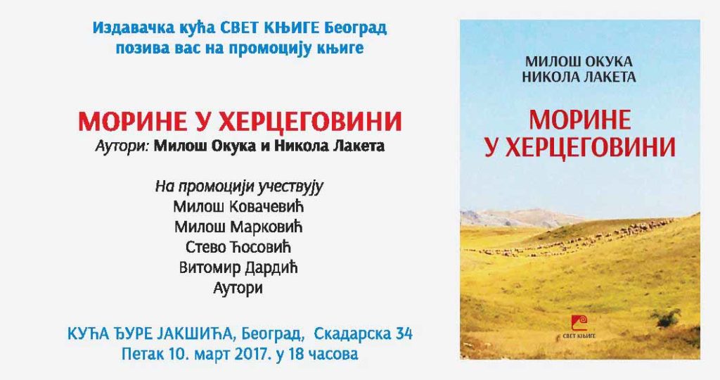 Књига Морине у Херцеговини, повијест о планини Милоша Окуке и Николе Лакете представља својеврстан летопис ове митске планине. У првом ауторском делу књиге – обимној историјско-етнографској студији, аутори су представили обиље података који читаоцима пружају детаљну и свеобухватну слику о Моринама и о људима који живе у селима на падинама планине. Пажњу посебно плене етнографски описи обичаја и народног живота, као и пажљиво предочен пресек догађаја из историје која је на овом подручју била неумољива и имала „више лица“ – како би рекао Андрић.