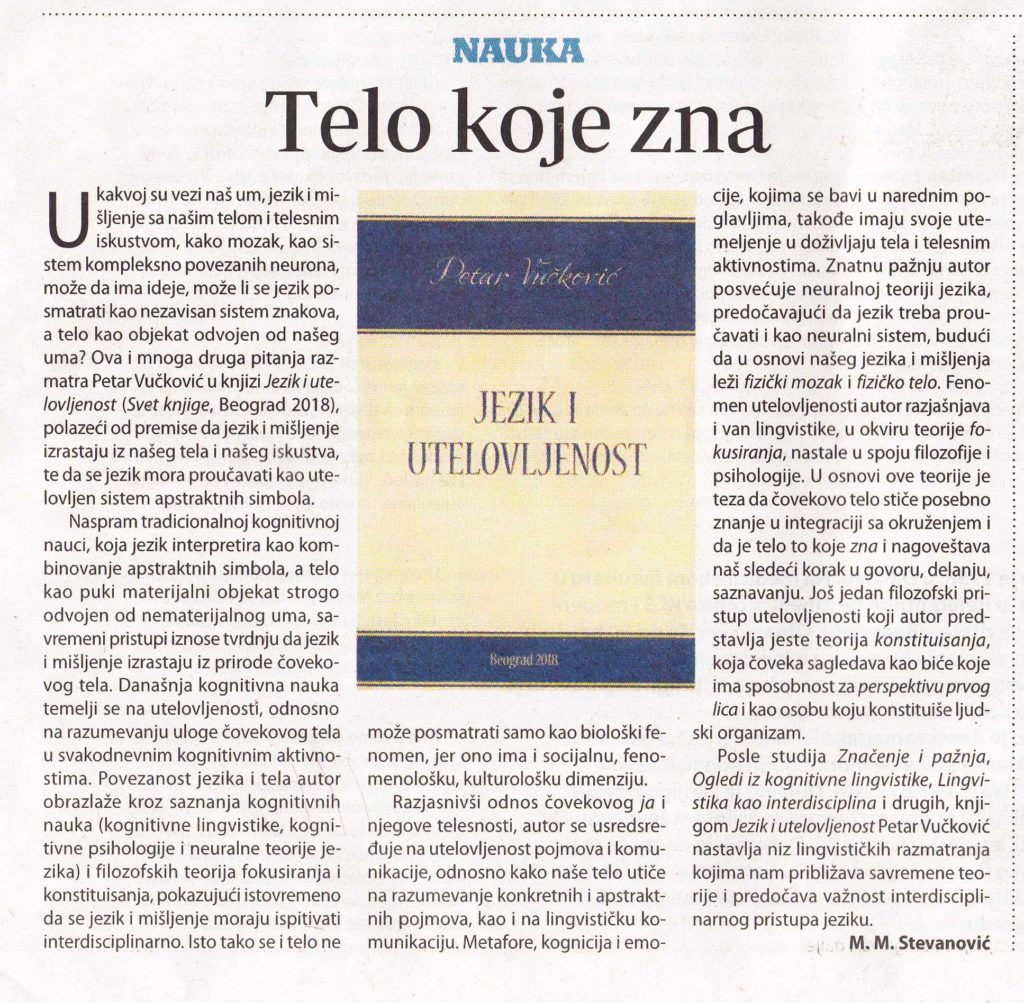 Осврт на књигу Језик и утеловљеност Петра Вучковића, дневне новине „Данас“, 30–31. март 2019.