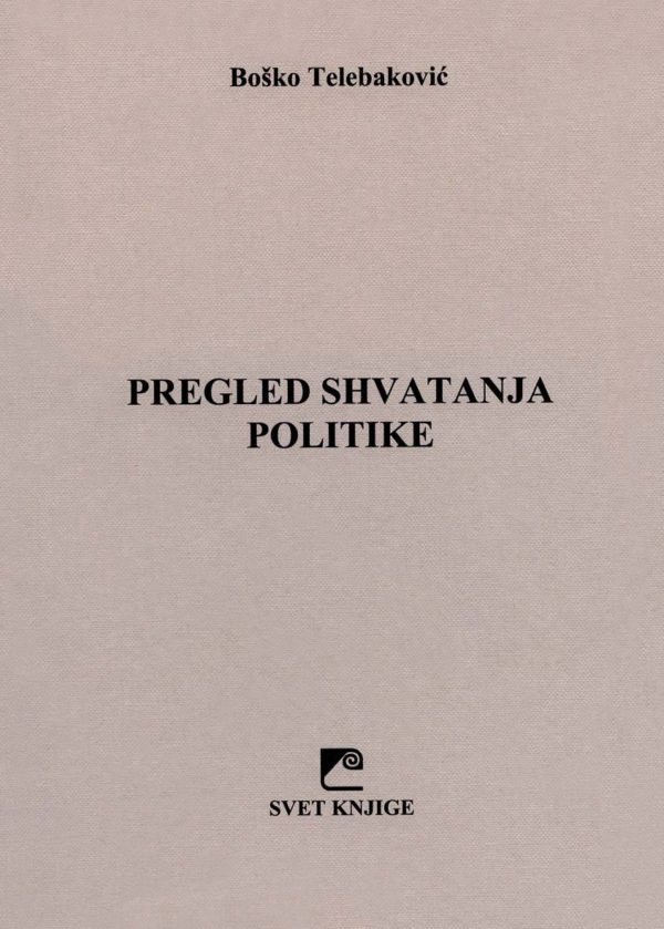 Књига садржи преглед најзначајних схватања политике, од античког периода (Сократа, Платона, Аристотела, стоика), Римског царства, хришћанства и Св. Августина, средњег века (Томе Аквинског), шпанских филозофа, Лутера, Калвина, Бодина, преко Декарта, Спинозе, Лајбница, Лока, Хјума, француских просветитеља, мислилаца америчке револуције. Приказана су и схватања модерних филозофа – Канта, Фихтеа, Шелинга, Маркса, Енгелса, Вебеа, Лењина, а размотрена су и питања глобализације, европеизације и балканизације.