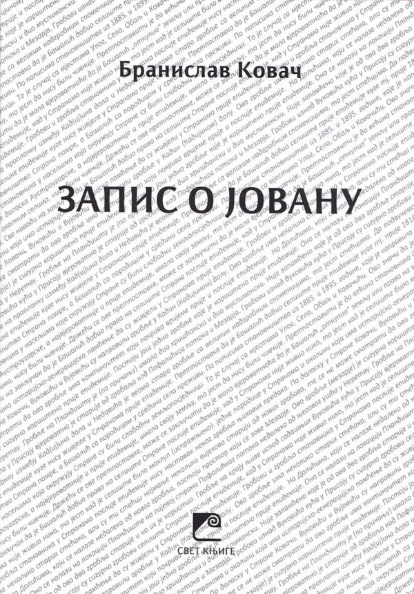 Роман Запис о Јовану описује живот Јована Ковача из села Стране, у горњем току Неретве. Дате су занимљиве приче о људима и догађајима из Јованове околине и времена. Подлогу Записа чини кратак, али прегледно изложен пресек имовинско-правних основа у Босни и Херцеговини с краја 19. века до данас. Јован је живео у три различита државно-политичка система. Био је аустријски регрут, краљев гардиста, сеоски првак и кнез, правни заступник, затвореник, богољуб и верник, али највише и увек сељак и тежак, коме је брига за породицу била најважнија. Иако бурне, историјско-друштвене прилике у којима је Јован живео описане су само колико је потребно да се разуме његов живот.